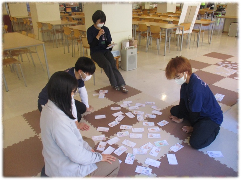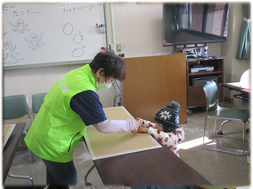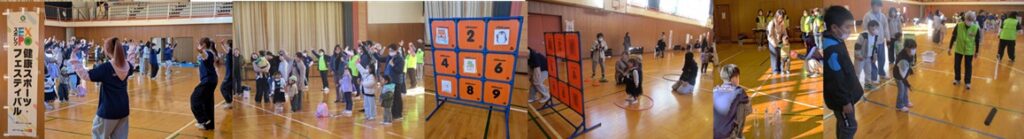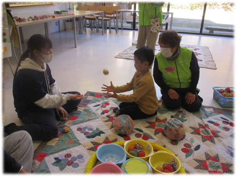 やわらかな陽ざしが降り注ぐなか、たくさんのご家族に来場だいたマルシェは、上田短期大学の学生による開会式と全員そろっての「サンサンたいそう」で幕を開け、裏山探検、ストラックアウト、室内モルック、ペットボトルボウリング、竹とんぼ、お手玉、カルタ、粘土細工等々、上田短期大学と松本大学の学生たちと東信レクリエーション協会が懸命に準備したブースには、たくさんの笑顔と楽しそうな笑い声があふれていました。