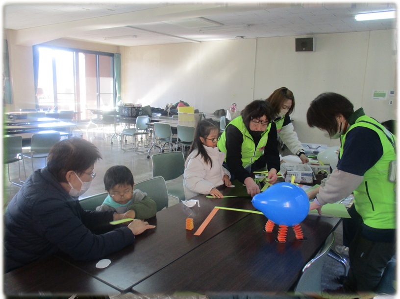 長野県レクリエーション協会では『作って遊ぼう おもちゃの部屋』ブースを運営し、「コロコロたまご」と「フワフワ風船」を作って遊びました。