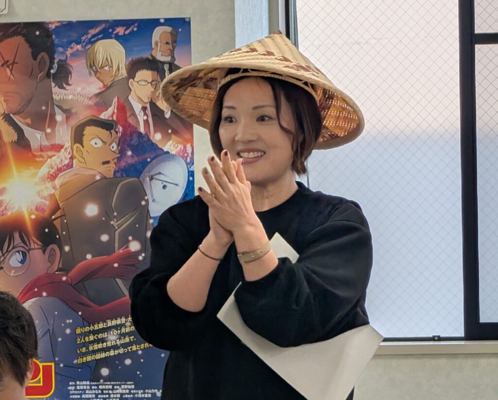 リーダは目立つ!ということで、伝統工芸品の「桧笠」と「南木曽ねこ」の装束で登場の佐藤さん。導入の手拍子から たし算ジャンケン、身体を使ってのジャンケン、勝ち抜き合体ジャンケンへと笑顔で展開され、最後は動から静へ。全員が黙ってアイコンタクト。誕生日順に整列しました。上手に並べたでしょうか...
