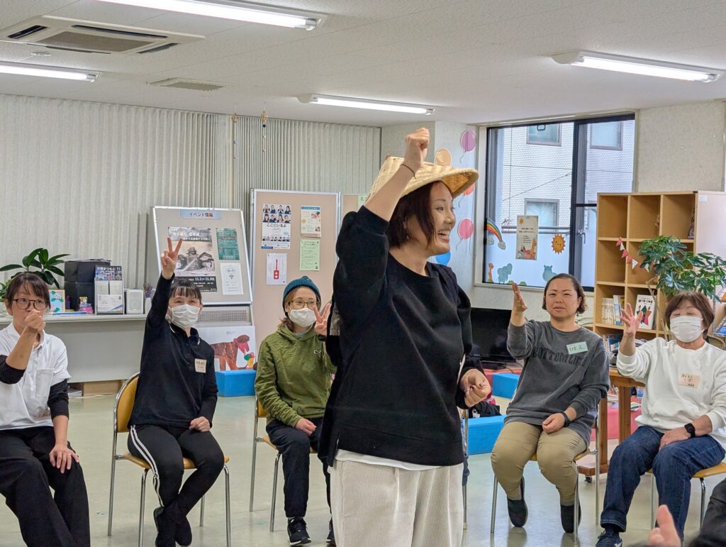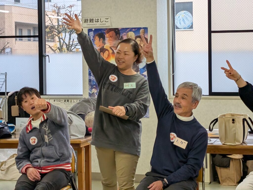 大きな深呼吸から始まったプログラムは、認知予防に効果的な「指あそび」に移り、手は2拍子で足は3拍子の「シナプソロジー」を「うさぎとかめ」の歌に合わせて展開。”いつもはもっとちゃんと出来ているのに”と笑う南澤さん。リーダーがいつも整然とプログラムを熟せるとは限りません。