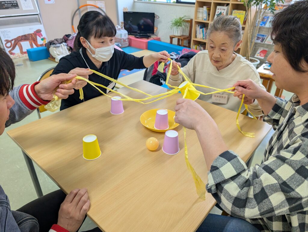 指あそびのシナプソロジーから始まって。ぶらぶらギュ!のひっかけ遊び。身近にある簡単な材料を使って紙コップ重ねは、4人のチームワークが試される課題でした。常に周りの状況を見て、はっきりとわかりやすい口調で語る上原さん。日頃から活躍されているであろう雄姿が想像できる1コマでした。