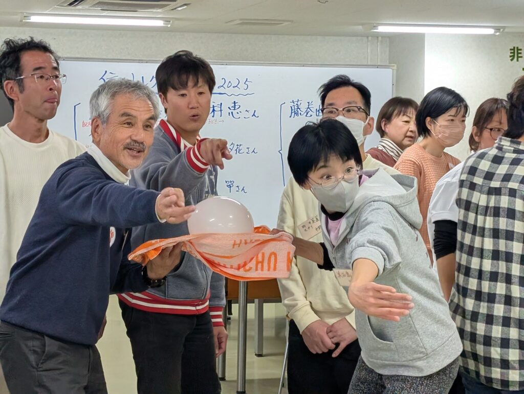 「輪くぐり」や「風船運びリレー」など、小さなハンディキャップを設定しての3チームの対抗戦が繰り広げられ、小学生に戻った受講者たちも、笑いながら、かなり真剣な面持ちでレースに熱中していました。
