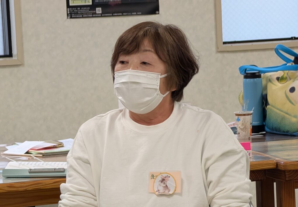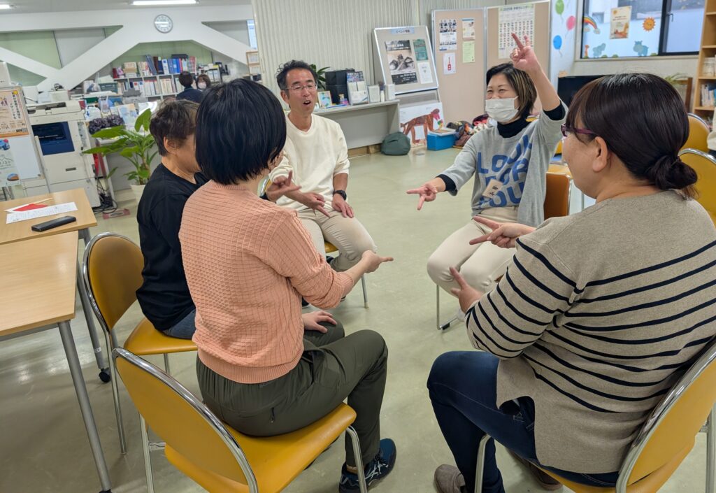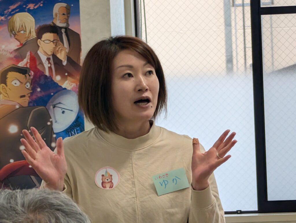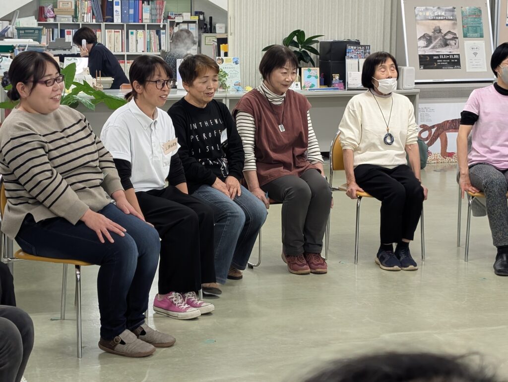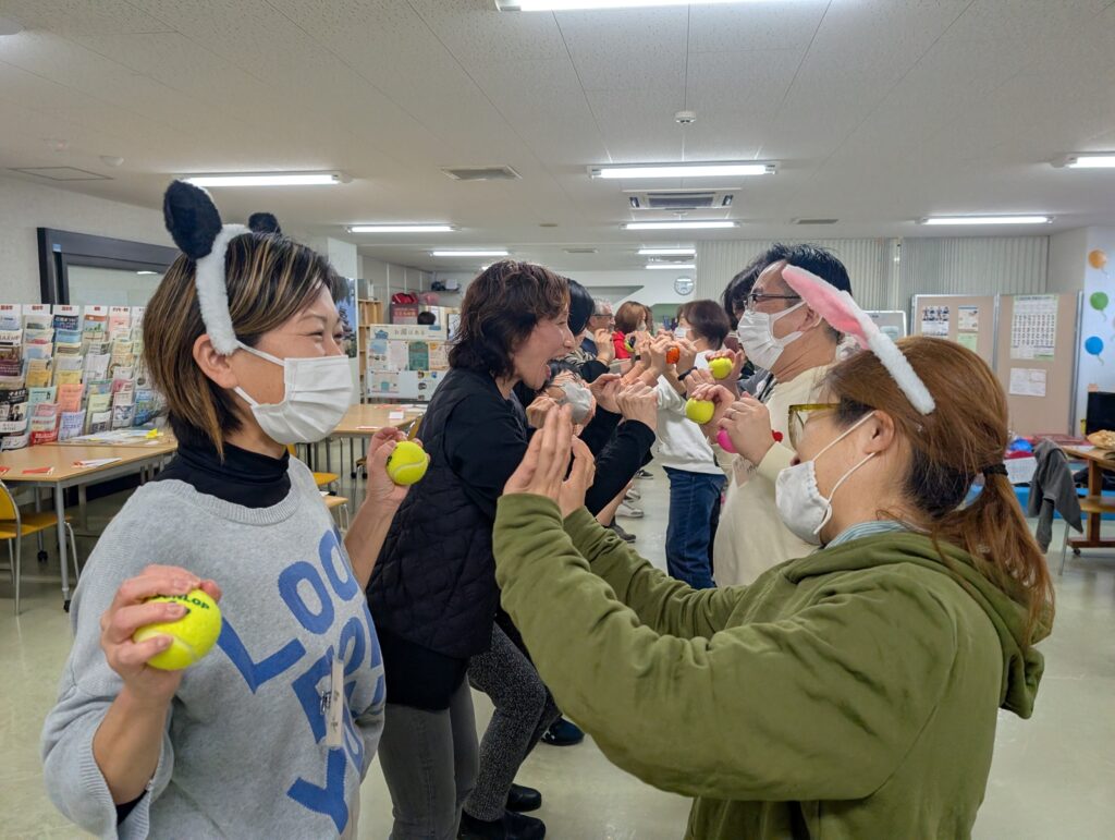 老若男女が楽しめる「とんち文字」は、高齢者にとっても脳トレになる人気プログラムで、岩崎さんの出す問題に受講者も頭をフル回転で挑んでいました。短期記憶を鍛える3つの動作の後に「どんぐりころころ」の歌に合わせて肩叩き。仲間の肩をやさしくトントンしました。